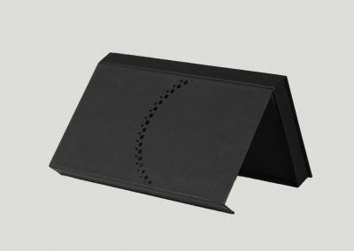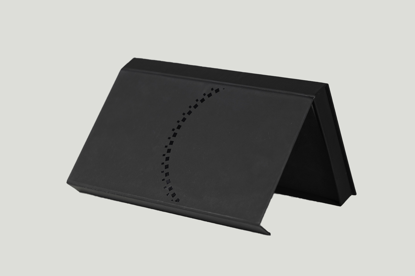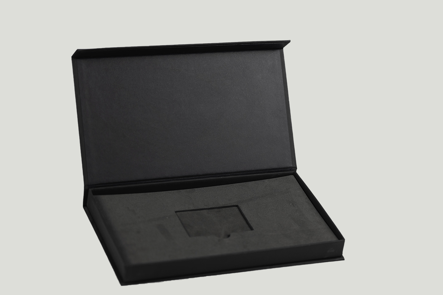 Caja para tarjeta de crédito/débito forrado en papel couche, con terminado plástico mate,  barniz  UV brillante a registro e inserto de foami.